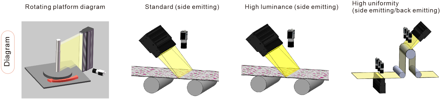 High brightness up to 2 million illumination, can add optical film to improve uniformity, adapted to circuit board surface and battery coating inspection.