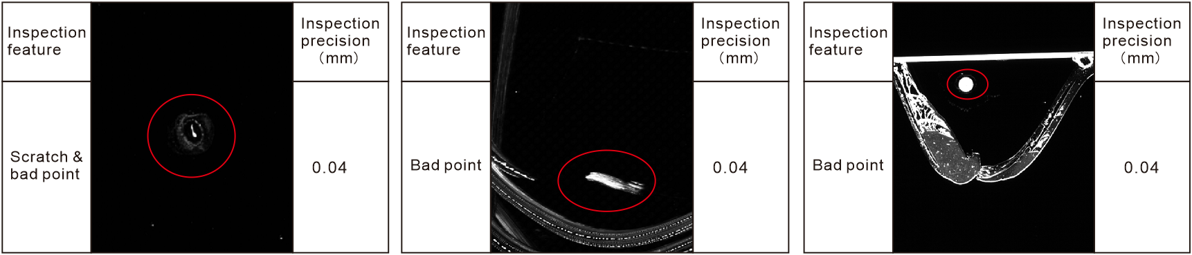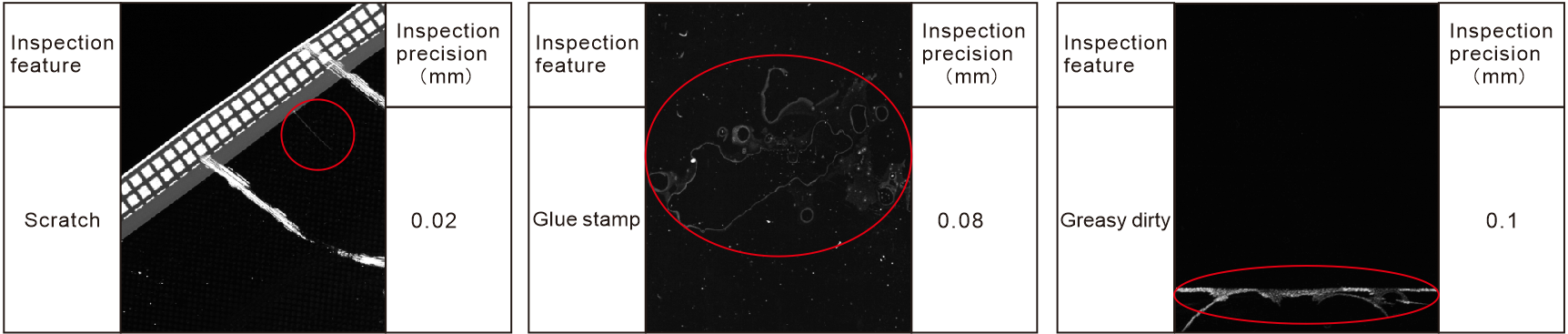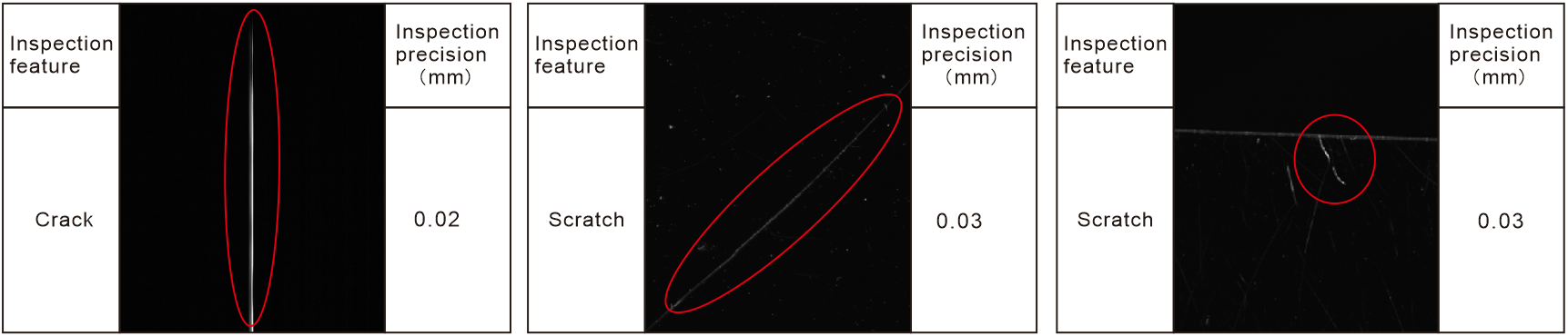 Scratch inspected from multiple angle, multiple direction light path have strong direction, obvious contrast between scratch and background. Tunnel line scan light have good uniformity, so that the defect homogenization, to make the contrast between scratch and background is not obvious