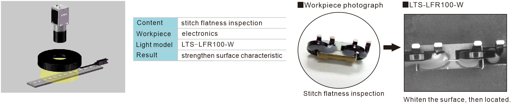 The LEDs are horizontally arranged on a flexible PCB and the object is illuminated evenly by reflecting, which can enhance the surface features (such as laser marking and etching) and the contrast of surface defects.