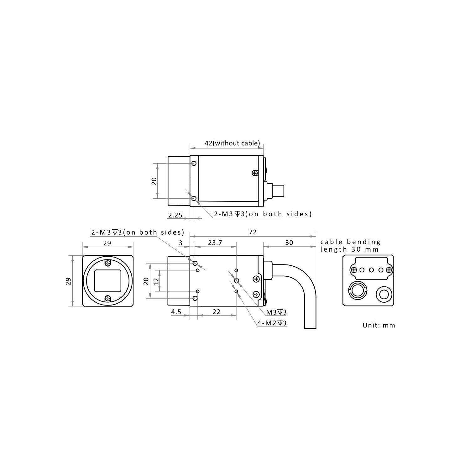 | Digital I/O | 17-pin M12 connector provides power and I/O, including none-isolated input × 1 (Line 2), none-isolated output × 1 (Line 3), configurable bi-directional none-isolated I/O × 2 (Line 0/1), RS-232 × 1. Device trigger via pressing button supported. | |