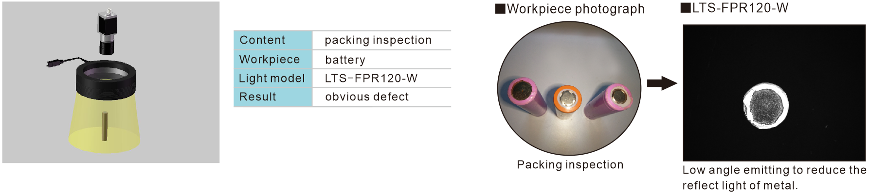 Ring shape and diffused, soft illumination; even illumination in the large square, without the shadow; ideal for flew or edge detection on reflective surfaces.
