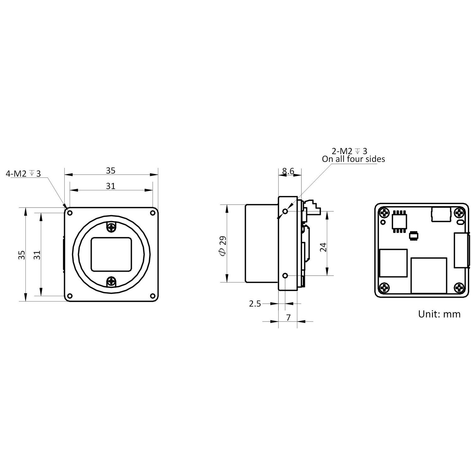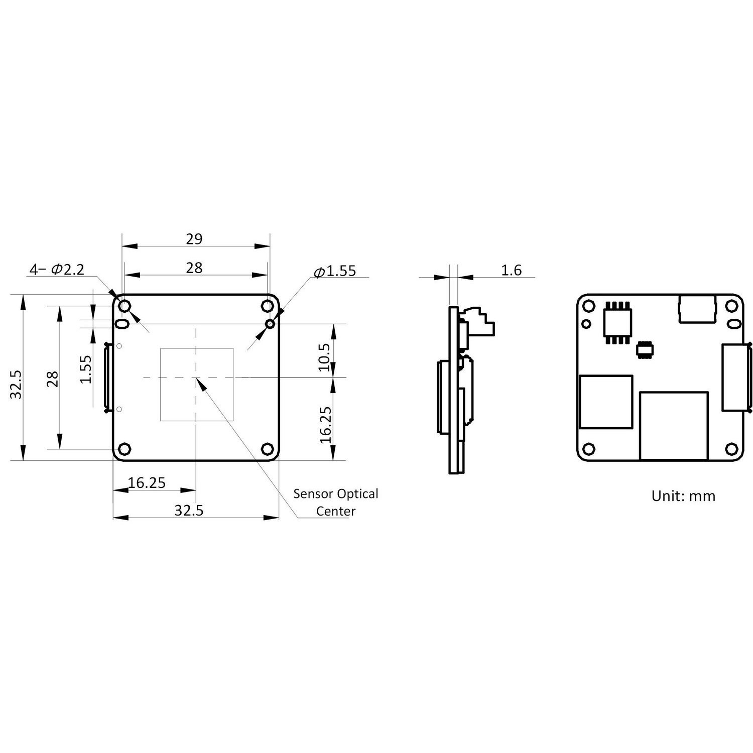 | Dimension | M12-mount camera: 35 mm × 35 mm × 8.6 mm (1.4″ × 1.4″ × 0.3″) | |